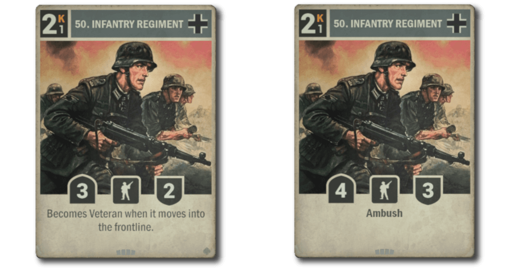 The 50. INFANTRY REGIMENT is a German Infantry unit of Standard rarity with the Veteran ability. It costs 2 Kredits to play, 1 Kredit to operate, has 3 attack and 2 defense. The 50. INFANTRY REGIMENT becomes Veteran when it moves into the frontline. When it's Veteran, it has 4 attack, 3 defense, and gains the Ambush ability.