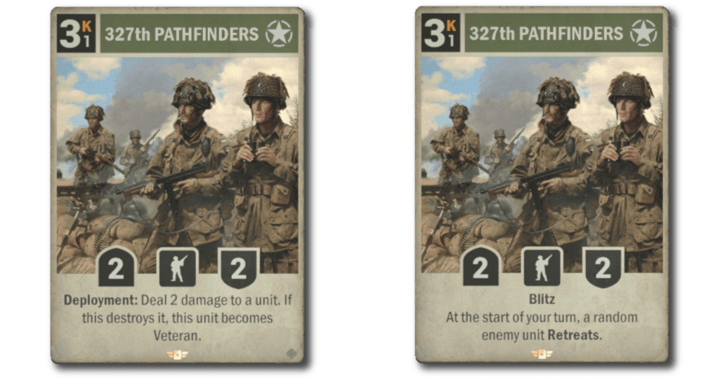 An Elite US Infantry unit, the 327th PATHFINDERS has 2 attack, 2 defense, costs 3 Kredits to play and 1 Kredit to operate. Its deployment effect deals 2 damage to a unit and, if this destroys it, the 327th PATHFINDERS becomes Veteran. In its Veteran form, this unit has Blitz and the effect that at the start of your turn, a random enemy unit Retreats.