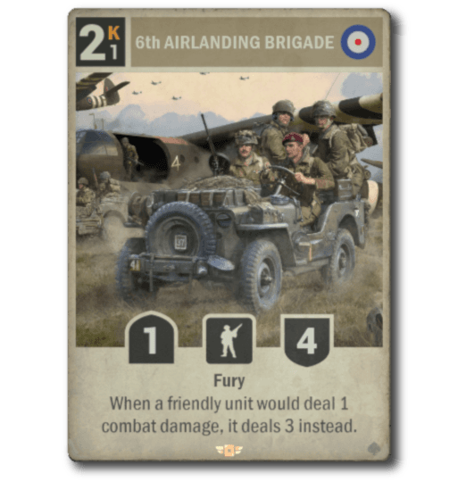 An Elite British Infantry unit, the 6th AIRLANDING BRIGADE has the Fury ability and the effect that when a friendly unit would deal 1 combat damage, it deals 3 instead. It has 1 attack, 4 defense, costs 2 Kredits to play and 1 Kredit to operate.