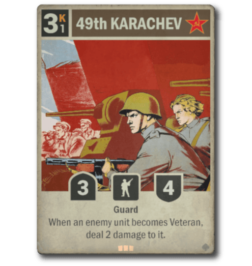 A Soviet Infantry unit of Limited rarity, the 49th KARACHEV has the Guard ability and, when an enemy unit becomes Veteran, deals 2 damage to it. It has 3 attack, 4 defense, costs 3 Kredits to play and 1 Kredit to operate.