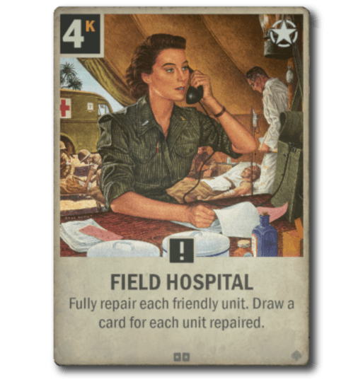 FIELD HOSPITAL is a Special US Order that costs 5 Kredits to play. When played, you fully repair each friendly unit and draw a card for each unit repaired.