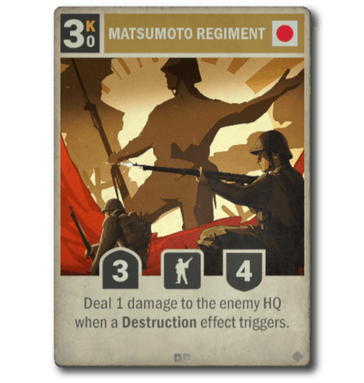 The MATSUMOTO REGIMENT is a Special Japanese Infantry unit that costs 3 Kredits to deploy and 0 Kredits to operate. It has 3 attack, 4 defense, and deals 1 damage to the enemy HQ when a Destruction effect triggers.