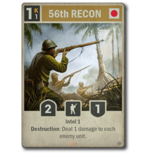 56th RECON is a Japanese Infantry unit of Limited rarity. It has 2 attack, 1 defense, costs 1 Kredit to play and 1 Kredit to operate. It has Intel 1 and the Destruction effect to deal 1 damage to each enemy unit.