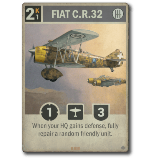 The FIAT CR.32 is a Limited Italian Fighter that costs 2 Kredits to play and 1 Kredit to operate. It has 1 attack, 3 defense, and the effect that when your HQ gains defense, you fully repair a random friendly unit.