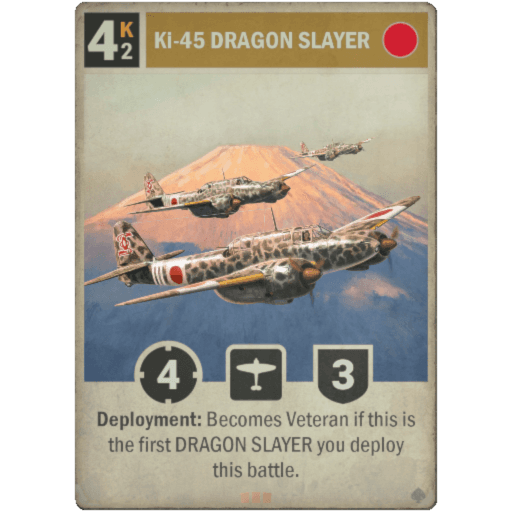 The Ki-45 DRAGON SLAYER is a Limited Japanese Fighter. It has 4 attack, 3 defense, costs 4 Kredits to deploy and 2 Kredits to operate. Its deployment effect makes it become Veteran if this is the first DRAGON SLAYER you deploy in the battle. When it's Veteran, the Ki-45 DRAGON SLAYER has 6 attack and 5 defense.
