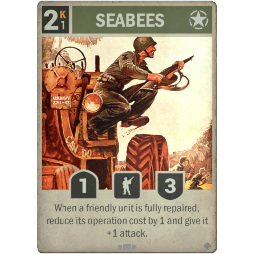 SEABEES is a Standard US Infantry unit with 1 attack and 3 defense. When a friendly unit is repaired, you reduce its operation cost by 1 and give it +1 attack. It costs 2 Kredits to play and 1 Kredit to operate.