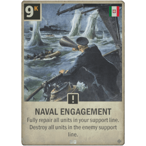 NAVAL ENGAGEMENT is a Special Italian Order that repairs all units in your support line and destroys all units in the enemy support line. It costs 9 Kredits to play.