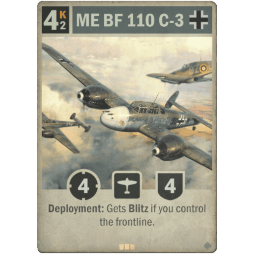 The ME BF 110 B-2 is a German Fighter of Limited rarity. It has 4 attack, 4 defense, costs 4 Kredits to play and 2 Kredits to operate. It has the deployment effect that it gets the Blitz ability if you control the frontline.