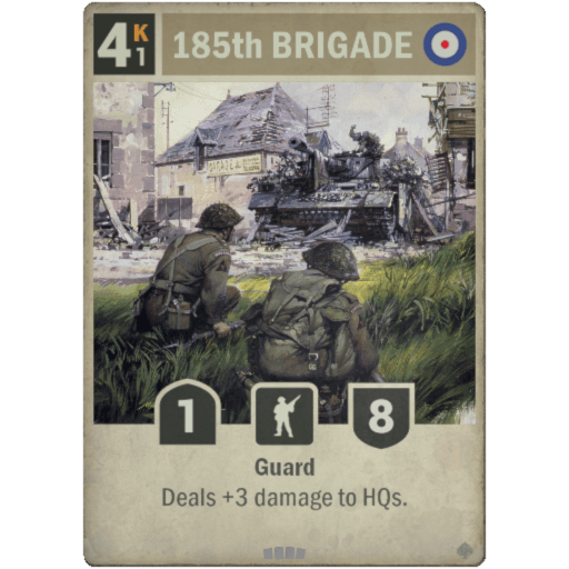 The 185th BRIGADE is a British Infantry unit of Standard rarity. It has 1 attack, 8 defense, costs 4 Kredits to play and 1 Kredit to operate. The 185th BRIGADE has the Guard ability and, additionally, deals +3 damage to HQs.