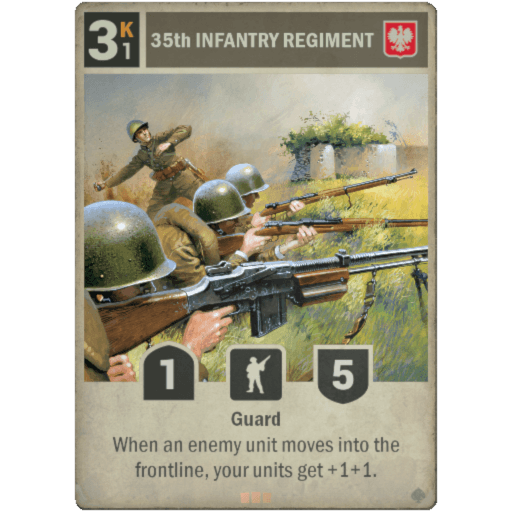 The 35th INFANTRY REGIMENT is a Polish Infantry unit with the Guard ability and, when an enemy unit moves into the frontline, your units get +1 +1. It has 1 attack, 5 defense, costs 3 Kredits to play and 1 Kredit to operate.