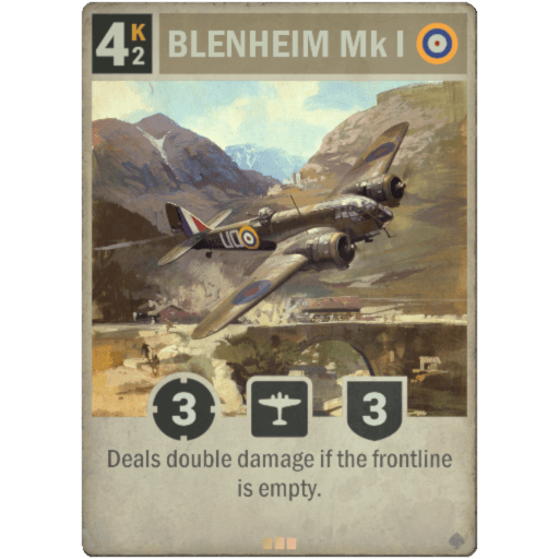 The BLENHEIM Mk I is a Limited British Bomber unit. It costs 4 Kredits to play, 2 Kredits to operate, has 3 attack and 3 defense. It deals double damage of the frontline is empty.
