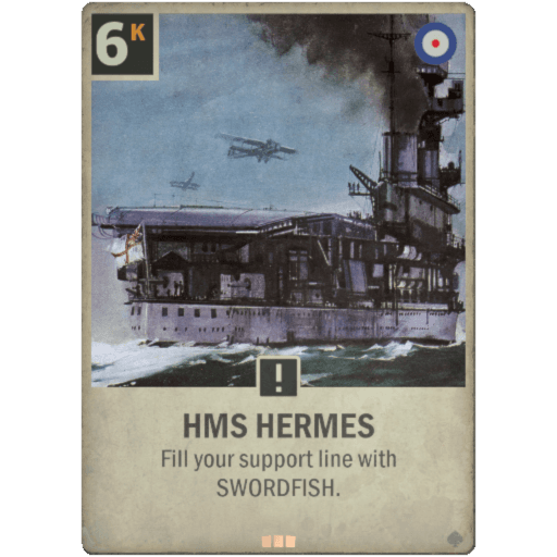A British Order card of Limited rarity, the HMS HERMES costs 6 Kredits to play and, when played, fills your support line with SWORDFISH.