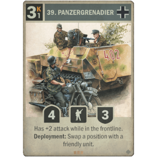 The 39. PANZERGRENADIER is a Limited German Infantry unit with 4 attack and 3 defense. It costs 3 Kredits to play and 1 Kredit to operate. While in the frontline, it has +2 attack. It also has the following deployment effect: swap a position with a friendly unit.