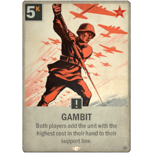An Elite Soviet Order, GAMBIT costs 5 Kredits to play and has the effect, that both players add the unit with the highest cost in their hand to their support line.