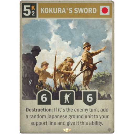KOKURA'S SWORD is en Elite Japanese Infantry unit with 6 attack and 6 defense. It costs 5 Kredits to deploy and 2 Kredits to operate. It has a destruction effect where, if it's the enemy's turn, you add a Japanese unit to your support line and give it this ability.