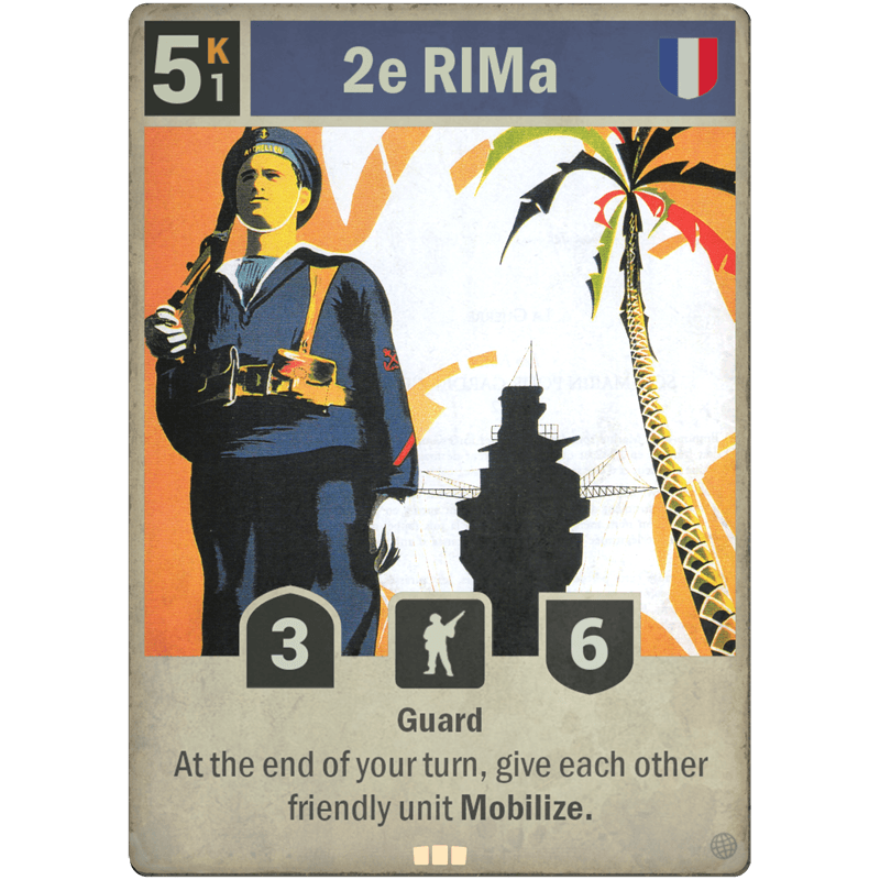 Das 2e Régiment d 'Infanterie de Marine (französisch: "2e Régiment d' Infanterie de Marine" oder "2e RIMa") ist ein Regiment der Troupes de Marine in der französischen Armee. Während des Zweiten Weltkriegs nahm das Regiment an der Schlacht von Frankreich teil und leistete Widerstand gegen deutsche Invasionstruppen in Amiens, wurde aber nach dem Fall Frankreichs 1940 aufgelöst. Die 2e RIMa wurde 1941 mit den Freien Französischen Streitkräften wieder aufgestellt und nahm an der Schlacht von Keren während der Ostafrikanischen Kampagne als Teil der Freien Französischen Brigade des Orients teil. 1942 trat das Regiment der 2. Freien Französischen Brigade bei, die 1943 Teil der 1. Freien Französischen Division wurde (1re Division Française Libre oder 1re DFL). Sie war an Einsätzen und Kampagnen in Libyen und Tunesien beteiligt, einschließlich der Schlacht von El Alamein und der Schlacht von Takrouna. Die 1re DFL schloss sich im April 1944 der italienischen Kampagne an, wo sie in der Schlacht von Pontecorvo kämpfte und während der Operation Dragoon, der alliierten Landung in Südfrankreich, in der Provence landete. 1945 schließlich kämpfte die Division als Teil der französischen Ersten Armee gegen deutsche Truppen in der Kolmar-Tasche und beteiligte sich an der Befreiung der Stadt.