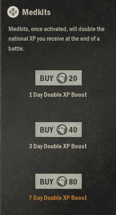 Los botiquines ahora están disponibles en tres formatos distintos. El botiquín anterior de 2 horas se ha cambiado a un botiquín de 24 horas. También hemos introducido dos variantes más del botiquín con dos duraciones distintas a distinto precio, lo que proporciona un gran valor a aquellos jugadores que busquen maximizar su ganancia de experiencia.