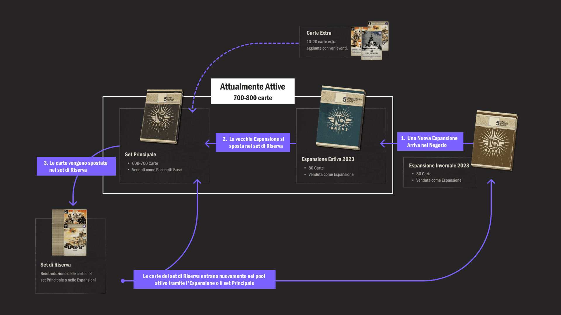 È inevitabile per tutti i giochi di carte che una volta raggiunto un certo numero di carte sorgano problemi. Il meta diventa troppo caotico, la costruzione del mazzo diventa tediosa, i nuovi giocatori vengono lasciati sempre più indietro e i problemi di "power-creep" diventano più diffusi. Attualmente abbiamo circa 800 carte in gioco (senza contare i QG), che riteniamo sia vicino al numero ottimale per KARDS. Questo è un po' meno di quello che si trova in alcuni altri giochi di carte, ma KARDS ha meno carte "filler" rispetto alla maggior parte dei suoi simili, quindi il numero effettivo di carte giocate è in verità simile.