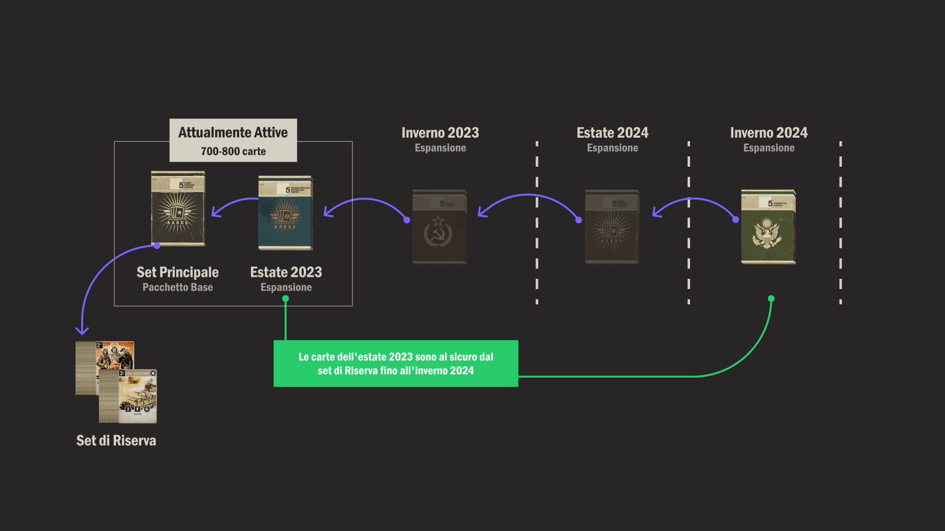 Se guardi di nuovo il diagramma sopra, noterai che le carte possono anche tornare dal set di Riserva nel set attivo. Una volta che questo sistema è attivo e funzionante, stiamo pianificando di reinserire circa 20 carte (il numero esatto può variare) dal set di Riserva ad ogni rotazione (ogni volta che una nuova espansione viene rilasciata). Naturalmente, questo non accadrà nella prima rotazione, poiché il set di Riserve sarà per lo più vuoto in quel momento (vedi sotto perché solo "per lo più"), ma dall'espansione invernale 2023 in avanti, un certo numero di carte tornerà dal set di Riserva. Il numero sarà molto al di sotto delle carte che ruotano, quindi il set di Riserva crescerà nel tempo e ciò significa che non tutte le carte torneranno dal set di Riserva. L'intenzione è che le carte che tornano dal set di Riserva ogni rotazione saranno carte di grande impatto, preferibilmente quelle che si adattano al tema generale dell'espansione con cui stanno tornando.