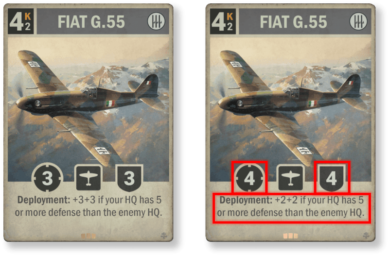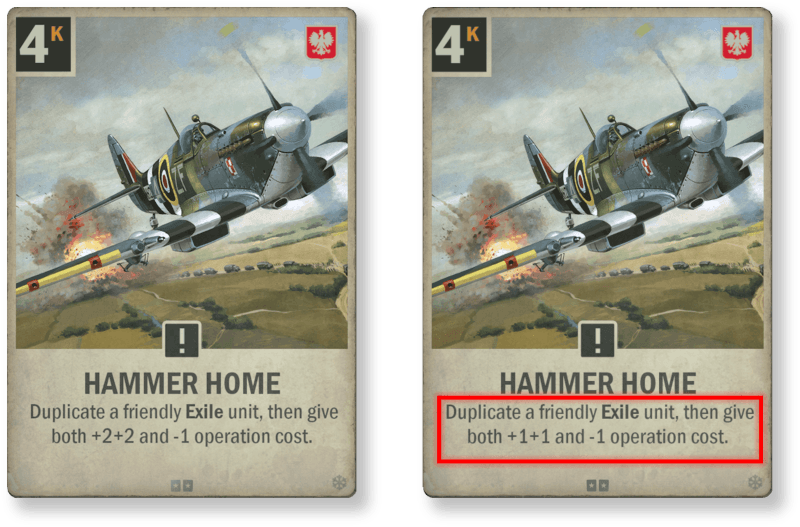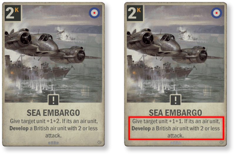 첫 번째는 해상 금수 조치 카드의 소폭 너프입니다. 영국 공군 덱은 순항중인 덱 중 하나이며 저희는 고점을 조금 낮추려 합니다. 해상 금수 조치는 이후에도 계속 사용할 수 있지만 그 효과가 약화되며 특히 전반적으로 중요한 초반부에 두드러집니다.