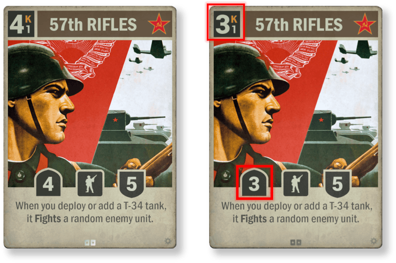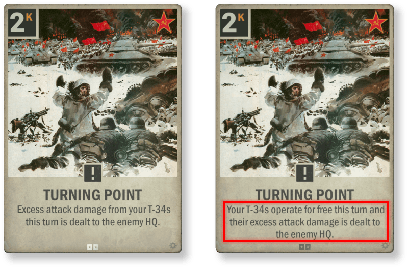 T-34 덱은 인기가 상당하며 플레이어가 해당 스타일의 덱을 즐긴다는 강력한 지표도 확인됐습니다. 하지만 이 덱의 파워 레벨은 저희가 원하는 것보다 약간 낮습니다. 이 변경 사항은 덱에 더 만은 전투 관련 카드를 투입하여 이른 턴에 전쟁 기계가 등장하도록 연계하는 것을 목표로 합니다.