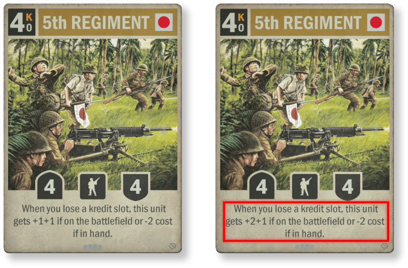 독특한 방식으로 플레이하는 덱에 대해 말하자면, 부분조립(SKD) 덱을 빼놓을 수 없습니다. 일부는 지난 여름 너프 폭풍에 노출되었습니다. 너프의 정도가 좀 가혹한 편이라 저희는 조금씩 재고하고 있습니다. 제5연대의 너프를 완전히 되돌리지는 않지만 능력치를 +2/+1 증가시키는 것은 확실히 버프라 할 수 있습니다.