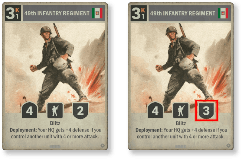 4의 공격력는 피와 강철의 테마 중 하나였으며 특히 이탈리아에서 두드러졌습니다. 제49보병연대는 해당 덱의 강력한 후보 위치에 있지만 약간 부족합니다. 이제 더 튼튼해졌으니, 더 많은 덱에서 활약할 수 있는지 보는 것도 재밌을 것입니다.