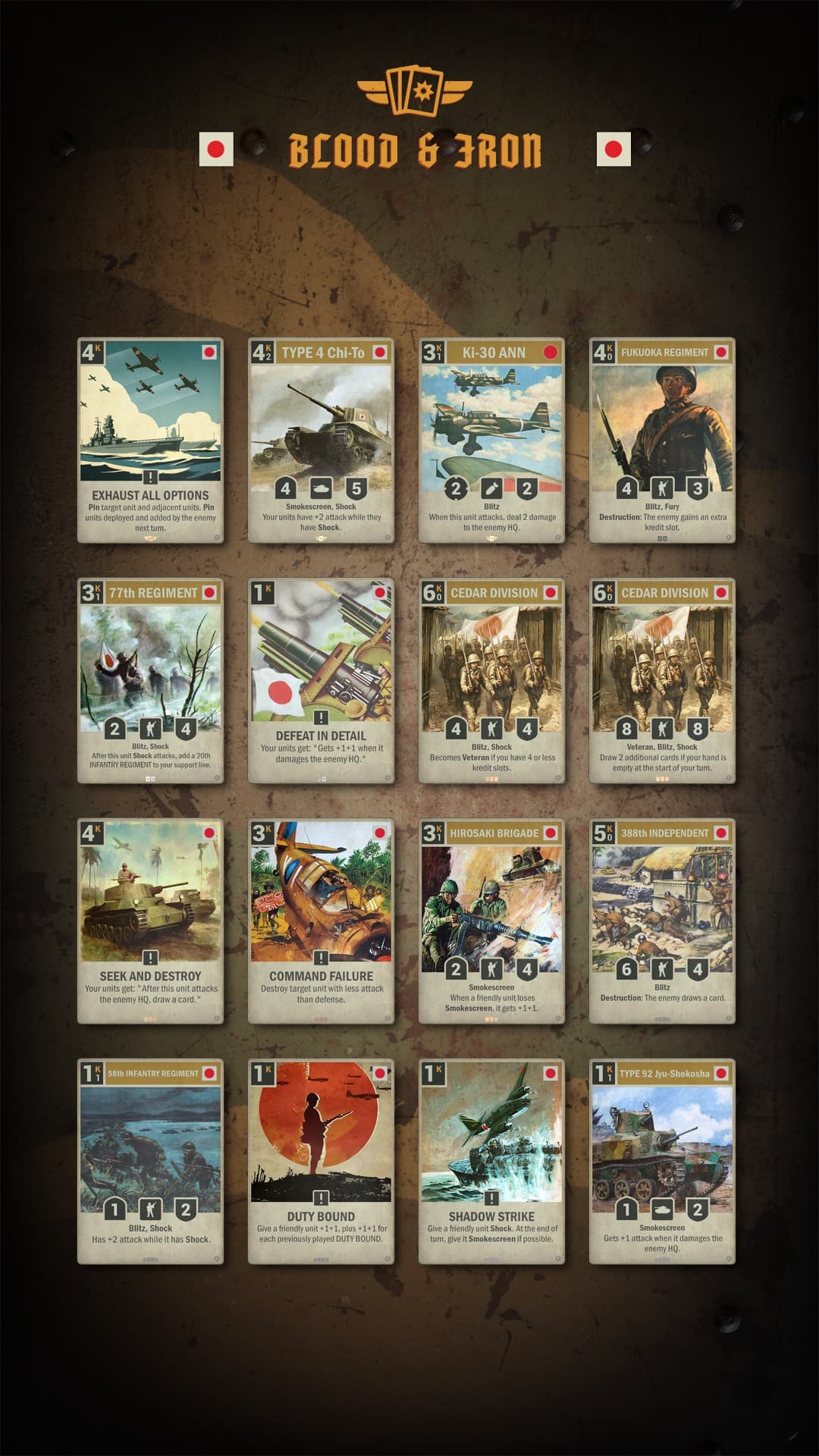 Japan’s deck focuses on fast, tactical Shock units and high-risk, high-reward strategies. Infantry dominates, while select large units bring powerful stats with unique challenges for opponents, ensuring Japan maintains its aggressive and unpredictable playstyle.