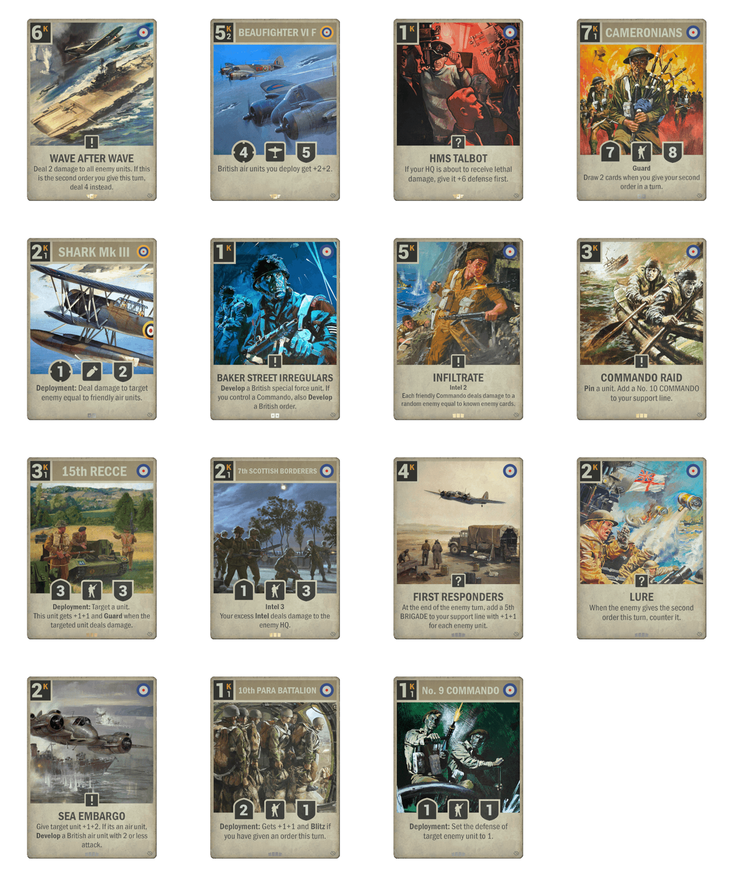 During WW2, Britain developed and heavily utilized Commando Units to sabotage, disrupt and infiltrate. We honour this by introducing a new commando unit to KARDS and adding more cards to lift the British Commando-theme into a prominent spotlight. In accordance with the prominent role of the Royal Air Force during WW2, Britain receives support for their air force. Furthermore, an intriguing new twist supports the second actions of a kind (e.g. second order given during a turn).
