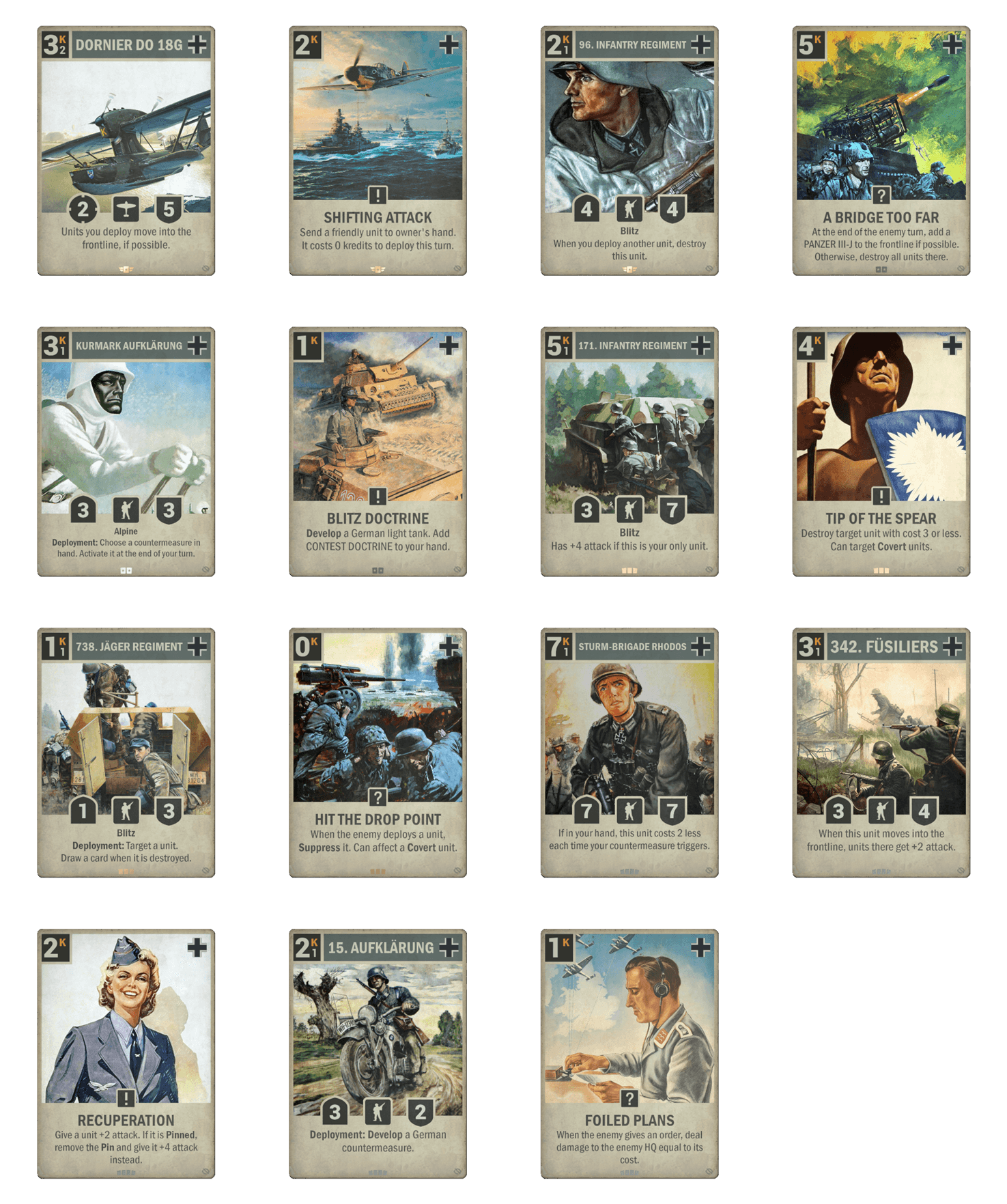 With Covert Operations, Germany receives solid support for their countermeasures. We see several new cards supporting this theme, providing interesting fresh approaches. Additionally and in accordance with the historical development in WW2, we see support for rapid deployment into the frontline. The German theme this summer is completed with a bit of anti-covert support and some stand-alone boosts.