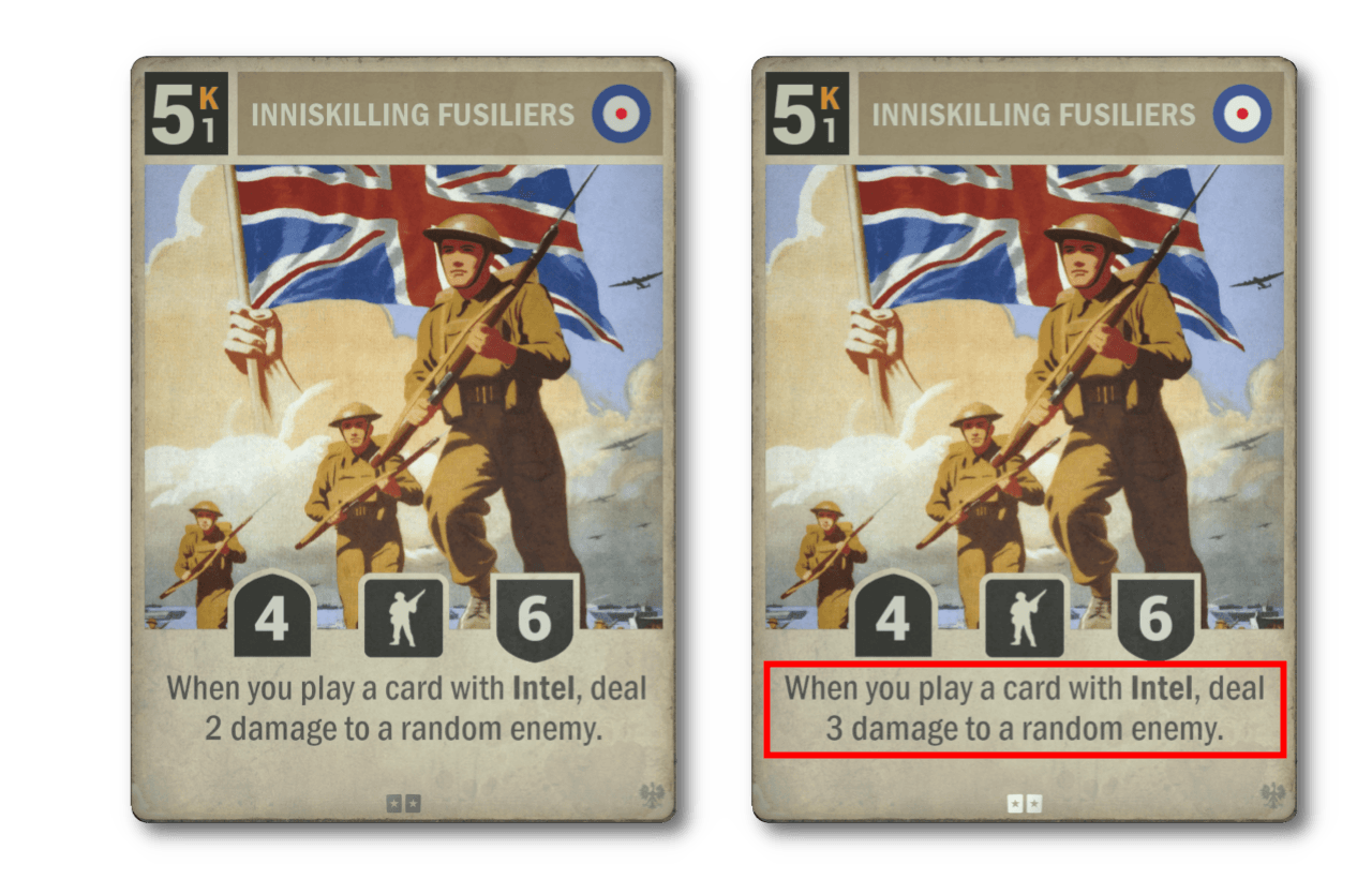 The ability on Inniskilling Fusiliers is rising from 2 to 3. Math tells us this is an increase of 50%, but our guts tells us it is much bigger, like a slowly digesting Shepard’s Pie. Intel decks have flirted with respectability for a while now, especially in legion with Legions. It now has a payoff card that demands respect and finally puts the Kill in Inniskilling.