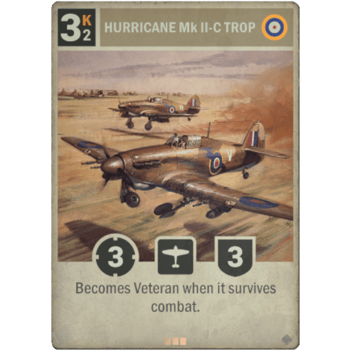 HURRICANE Mk II-C TROP is a Limited British Fighter. It has 3 attack, 3 defense, costs 3 Kredits to play and 2 Kredits to operate. It is a Veteran unit, which becomes Veteran when it survives combat. In its Veteran form, it has 5 attack and 5 defense.