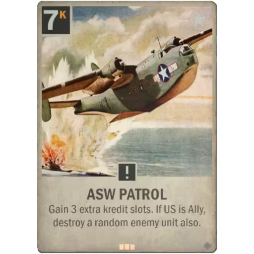 ASW PATROL is a Limited US Order which costs 7 Kredits to play. When played, gain 3 extra Kredit slots. If US is Ally, destroy a random enemy unit also.