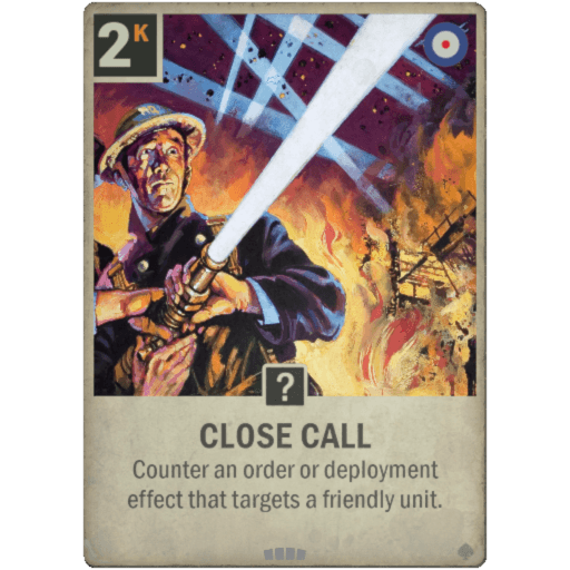 CLOSE CALL is a Standard British Countermeasure. It costs 2 Kredits to activate and has the following effect: when a friendly unit is targeted by an Order or deployment effect, counter the effect.