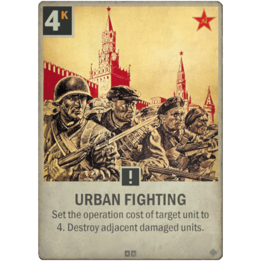 URBAN FIGHTING is a Special Soviet Order. It costs 4 Kredits to play and has the effect, to set the operation cost of target unit to 4, and destroy adjacent damaged units.