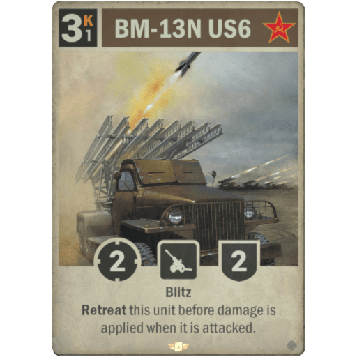 The BM-13N US6 is an Elite Soviet Artillery unit with 2 attack, 2 defense, the Blitz ability and the effect: "Retreat this unit before damage is applied when it is attacked". It costs 3 Kredits to play and 1 Kredit to operate.