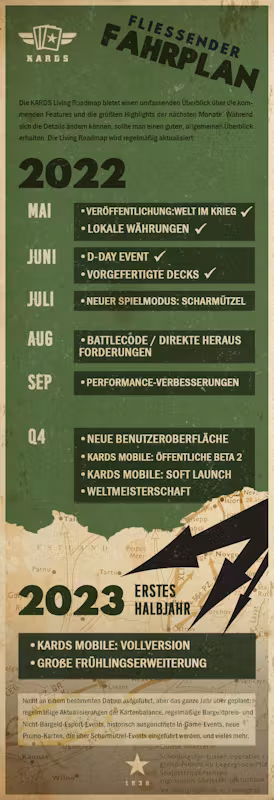 Der Fahrplan ist eine regelmäßig aktualisierte Übersicht über die Meilensteine und wichtigen Ereignisse für KARDS: Der Fahrplan enthält nur die größten bevorstehenden Features.