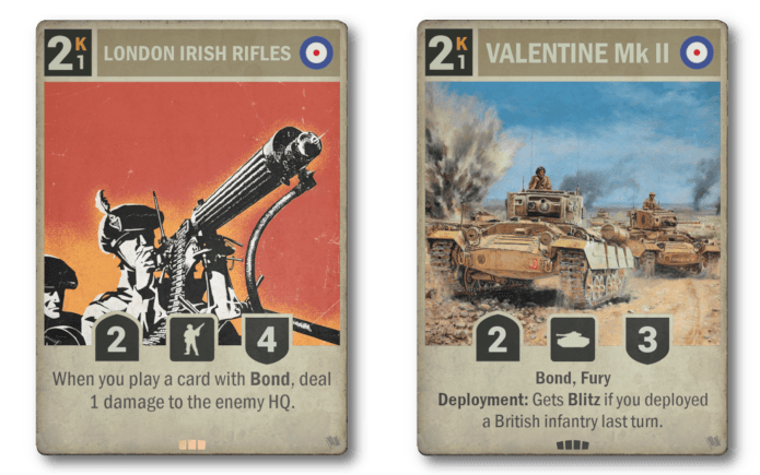 Los FUSILEROS IRLANDESES DE LONDRES infligen uno de daño al cuartel general enemigo cada vez que juegas una carta con Vínculo. VALENTINE Mk II no solo tiene Vínculo, lo que activa ese efecto, sino que también obtiene Blitz en el despliegue si jugaste una unidad de infantería británica en el último turno. Combinado con su habilidad Furia que le permite atacar dos veces, este dúo golpea con fuerza.