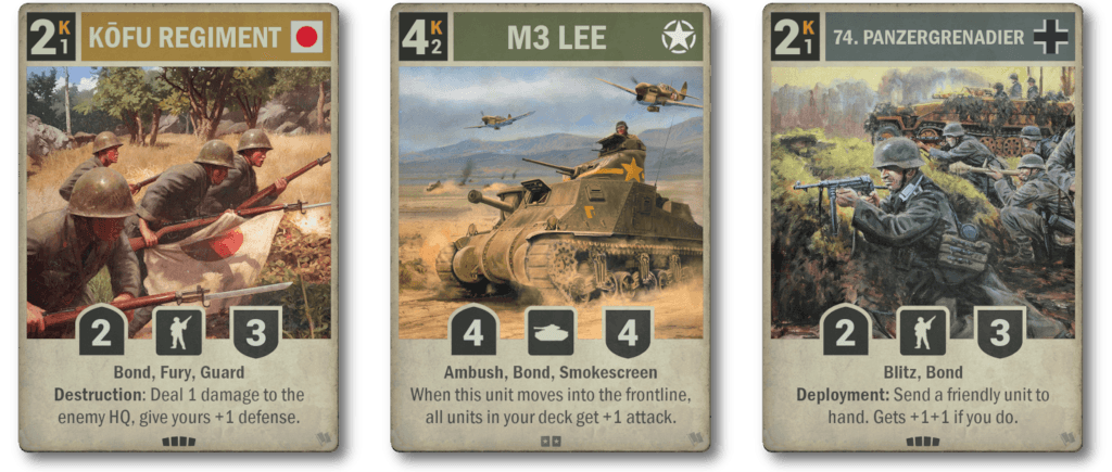 Mientras tanto, cartas como REGIMIENTO DE KOFU, M3 LEE y 74.º PANZERGRENADIER, ofrecen efectos poderosos si eres capaz de asumir los riesgos que implican las fuerzas divididas. Estas cartas recompensan la construcción de mazos meditada y la secuenciación de jugadas precisa, y su cohesión es de suma importancia.