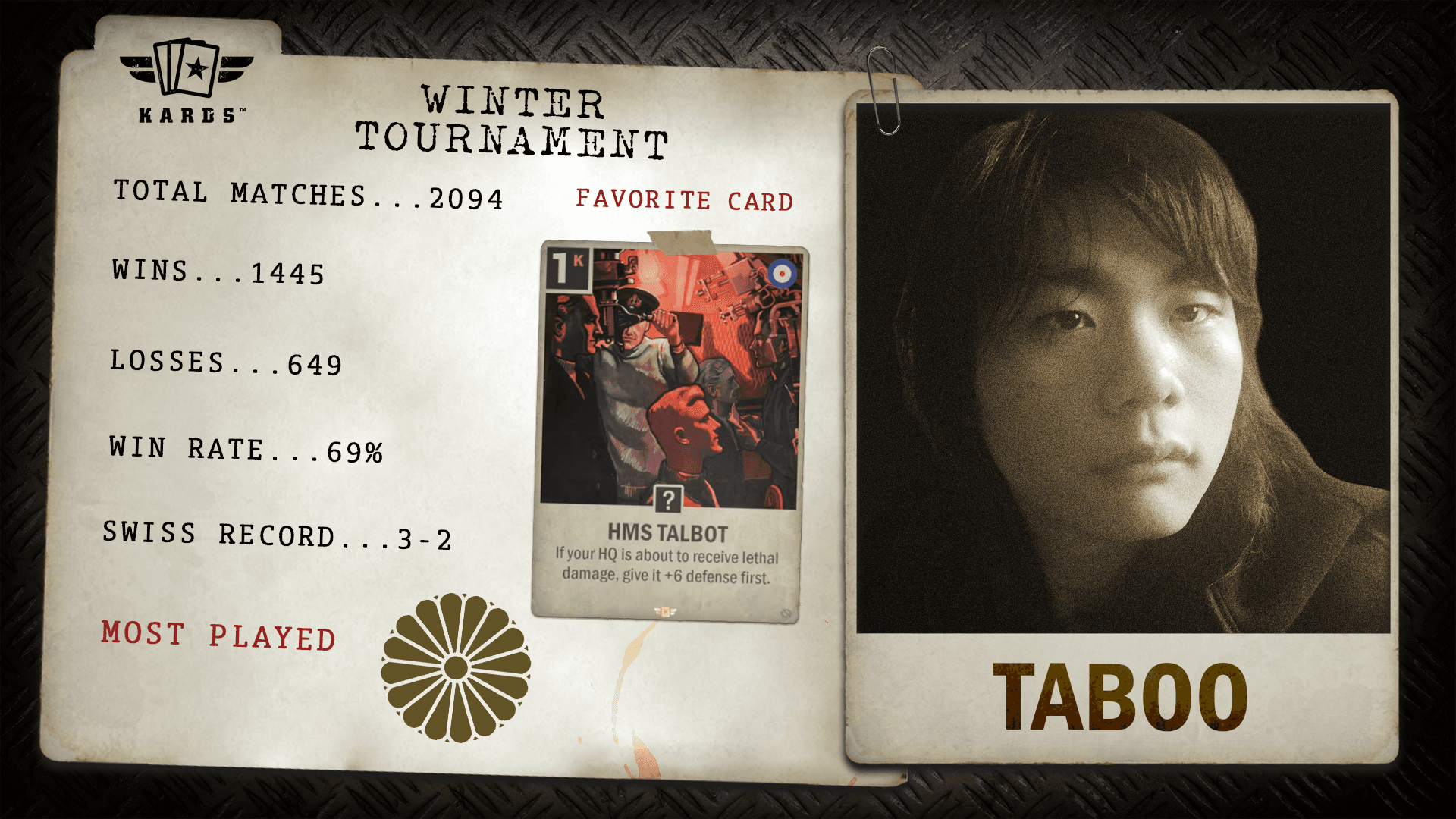 Una potencia destacada del Campeonato Mundial, Taboo se abrió camino hasta el 3.º Lugar tras un duro enfrentamiento de semifinales contra el actual Campeón del Mundo. Taboo recibe 500 USD y un lugar bien merecido entre los mejores del Torneo de Invierno.