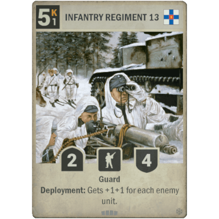 La unidad de infantería finlandesa de rareza Básica, 13.º REGIMIENTO DE INFANTERÍA, tiene 2 de ataque y 4 de defensa. Ponerla en juego cuesta 5 kréditos y operar con ella 1 krédito. Tiene la habilidad Guardia y el efecto de despliegue de obtener +1 +1 por cada unidad enemiga.