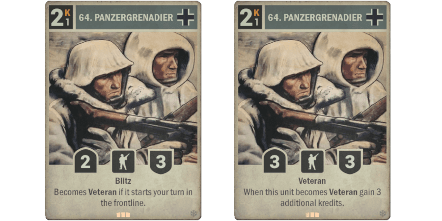 El 64.º PANZERGRENADIER es una unidad de infantería alemana de rareza Limitada con las habilidades Blitz y Veterana. Tiene 2 de ataque, 3 de defensa, ponerla en juego cuesta 2 Kréditos y operar con ella 1 Krédito. Se convierte en Veterana si comienza tu turno en el frente. Cuando esta unidad se convierte en Veterana, obtienes 3 kréditos adicionales. Tiene 3 de ataque y 3 de defensa en su forma Veterana.