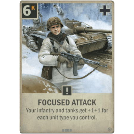 ATAQUE CONCENTRADO es una Orden alemana de rareza Básica. Jugarla cuesta 6 kréditos y, cuando se juega, le otorga a tu infantería y tanques +1+1 por cada tipo de unidad que controles.