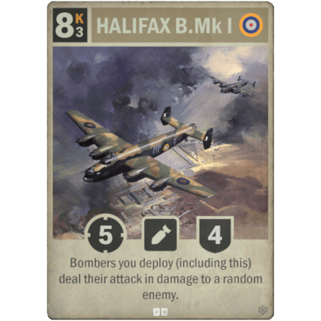 El HALIFAX B Mk. I es un bombardero británico de rareza Especial. Ponerlo en juego cuesta 8 kréditos y operar con él cuesta 3 kréditos. Tiene 5 de ataque, 4 de defensa y la habilidad de que los bombarderos que despliegues (él incluido) infligen su ataque como daño a un enemigo al azar.