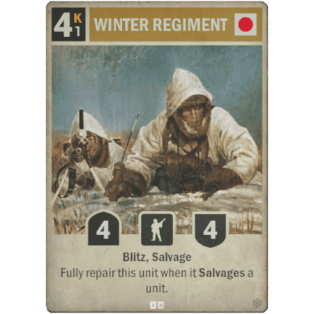 REGIMIENTO INVIERNO es una unidad de infantería japonesa de rareza Especial. Ponerla en juego cuesta 4 kréditos y operar con ella 1 krédito. Tiene 4 de ataque, 4 de defensa, tanto Blitz como Reutilización, y esta unidad se repara por completo cuando Reutiliza una unidad.