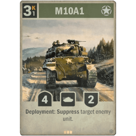 El M10A1 es un tanque estadounidense de rareza Limitada. Ponerlo en juego cuesta 3 Kréditos, operar con él 1 Krédito y tiene 4 de ataque y 2 de defensa. Tiene el efecto de despliegue de Neutralizar una unidad enemiga objetivo.