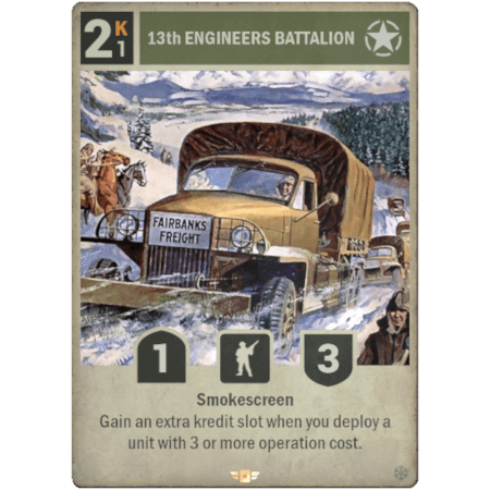 13.º BATALLÓN DE INGENIEROS es una unidad de infantería estadounidense de rareza Élite. Ponerla en juego cuesta 2 kréditos, operar con ella 1 krédito, y tiene 1 de ataque y 3 de defensa. Tiene la habilidad Cortina de humo y el efecto de que obtienes un espacio para kréditos adicional cuando despliegas una unidad con costo de operación 3 o superior.