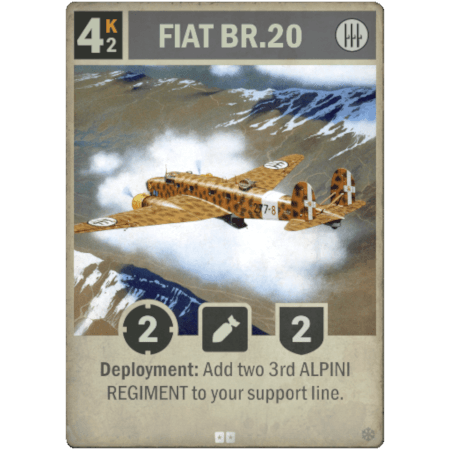 El FIAT BR.20 es un bombardero italiano de rareza Especial. Ponerlo en juego cuesta 4 kréditos y operar con él 2 kréditos. Tiene 2 de ataque, 2 de defensa y el efecto de despliegue de añadir dos 3.º REGIMIENTO DE ALPINOS a tu línea de apoyo.