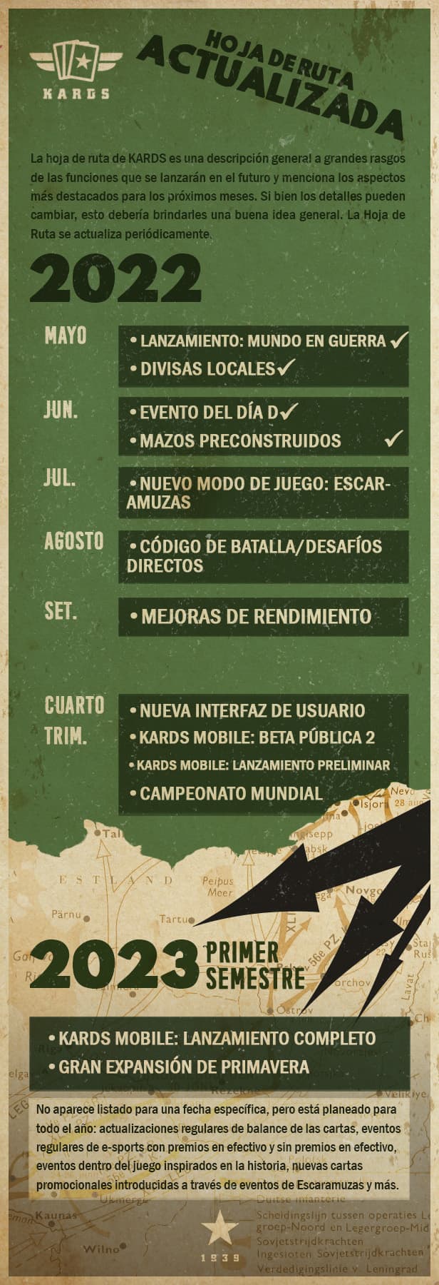 La hoja de ruta es una visión general a grandes rasgos que se actualiza con frecuencia de los hitos y eventos importantes de KARDS: la hoja de ruta muestra solo el nivel más general de características.