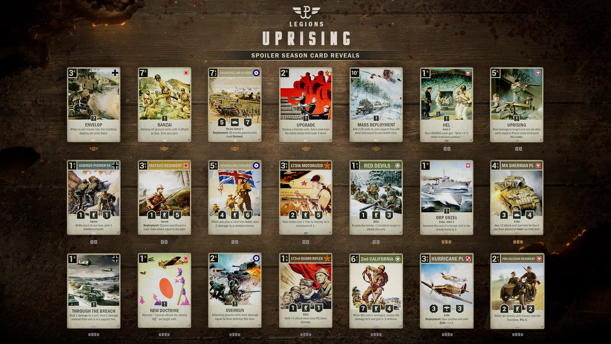 Insurrection, la dernière mise à jour de KARDS, renforce le set Légions avec un total de 53 nouvelles cartes (21 différentes). Toutes les nations majeures reçoivent trois nouvelles cartes en renforts (une Élite, une Spéciale et une Standard). La Pologne, nation alliée, est renforcée avec six nouvelles cartes. cards.